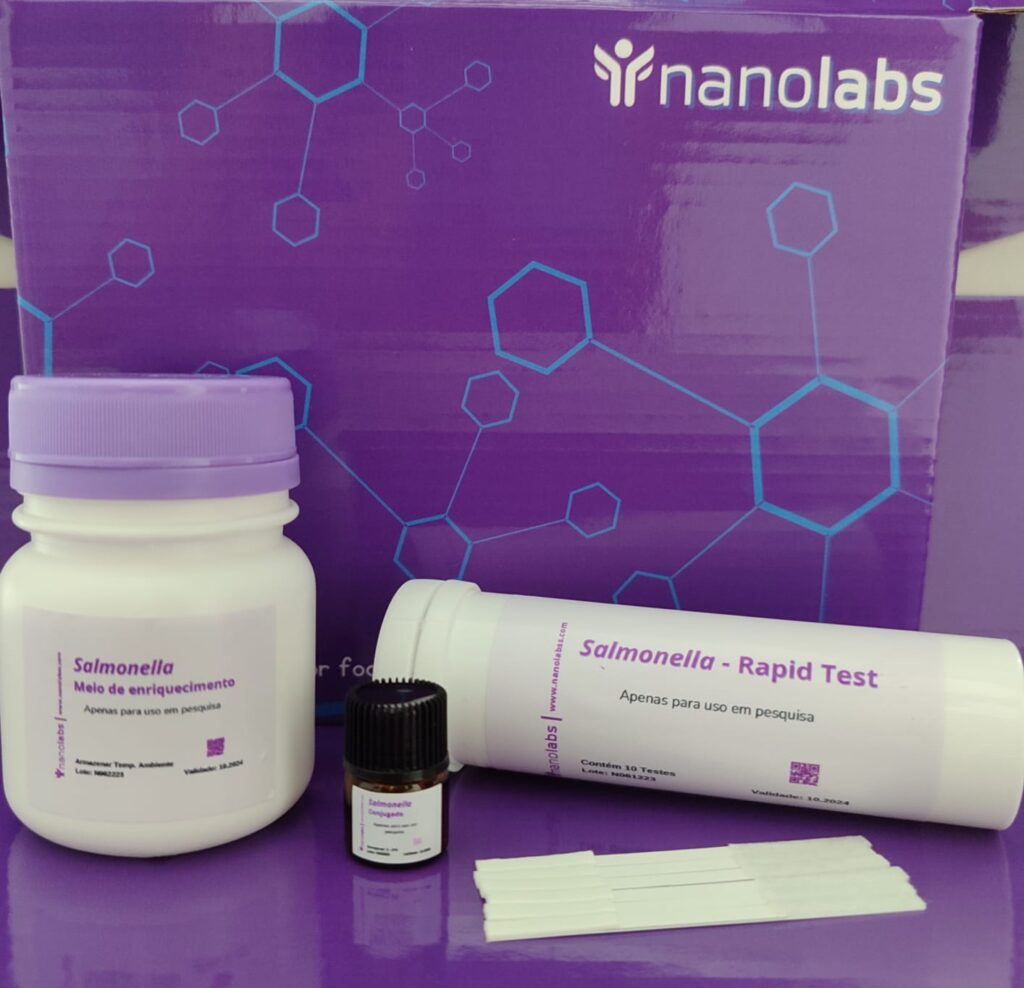 Atualmente desenvolvemos um kit de detecção rápida de Salmonella em alimentos baseado no teste imunocromatográfico de fluxo lateral e nanopartículas de ouro com resultados obtidos em minutos.